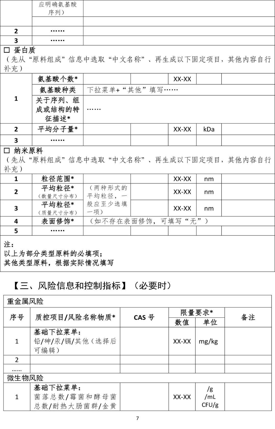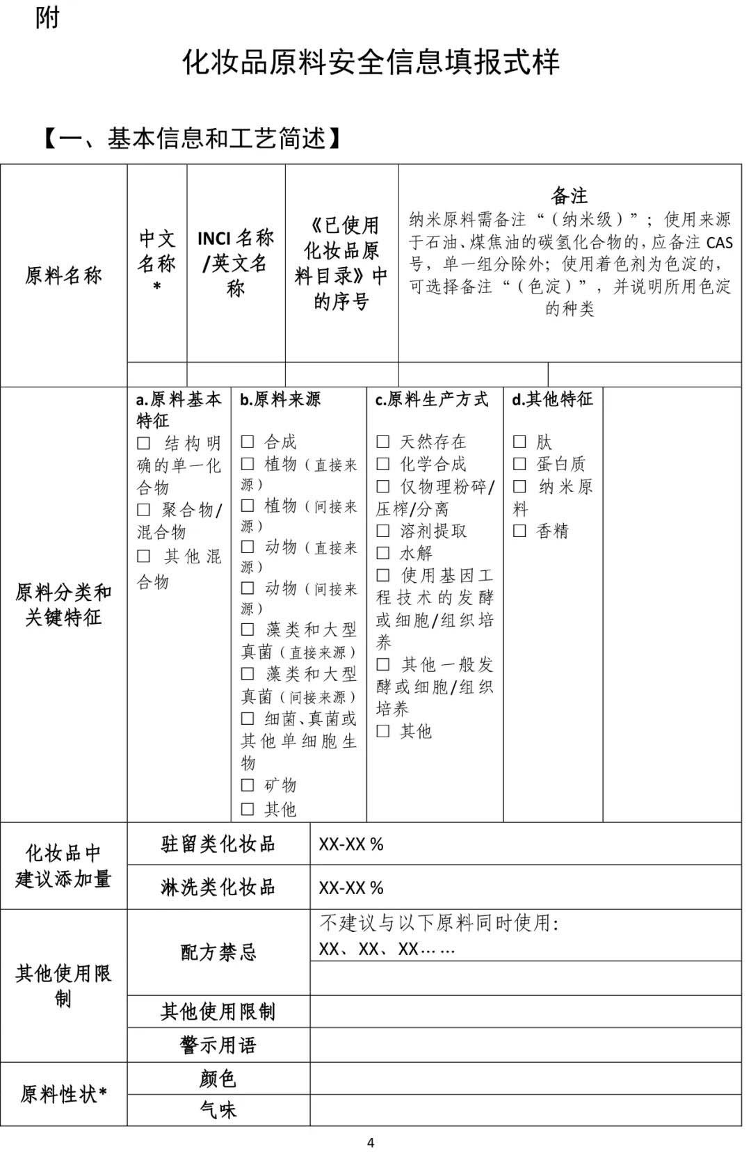 第七条 化妆品原料安全信息主要包括原料质量规格、安全性风险物质控制、原料安全风险评估结论等与原料安全相关的内容,填报式样见附件。